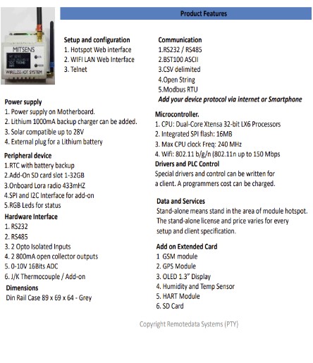 The module make use of RS232 / RS485 and I/O to collect sensor, scale, or any
